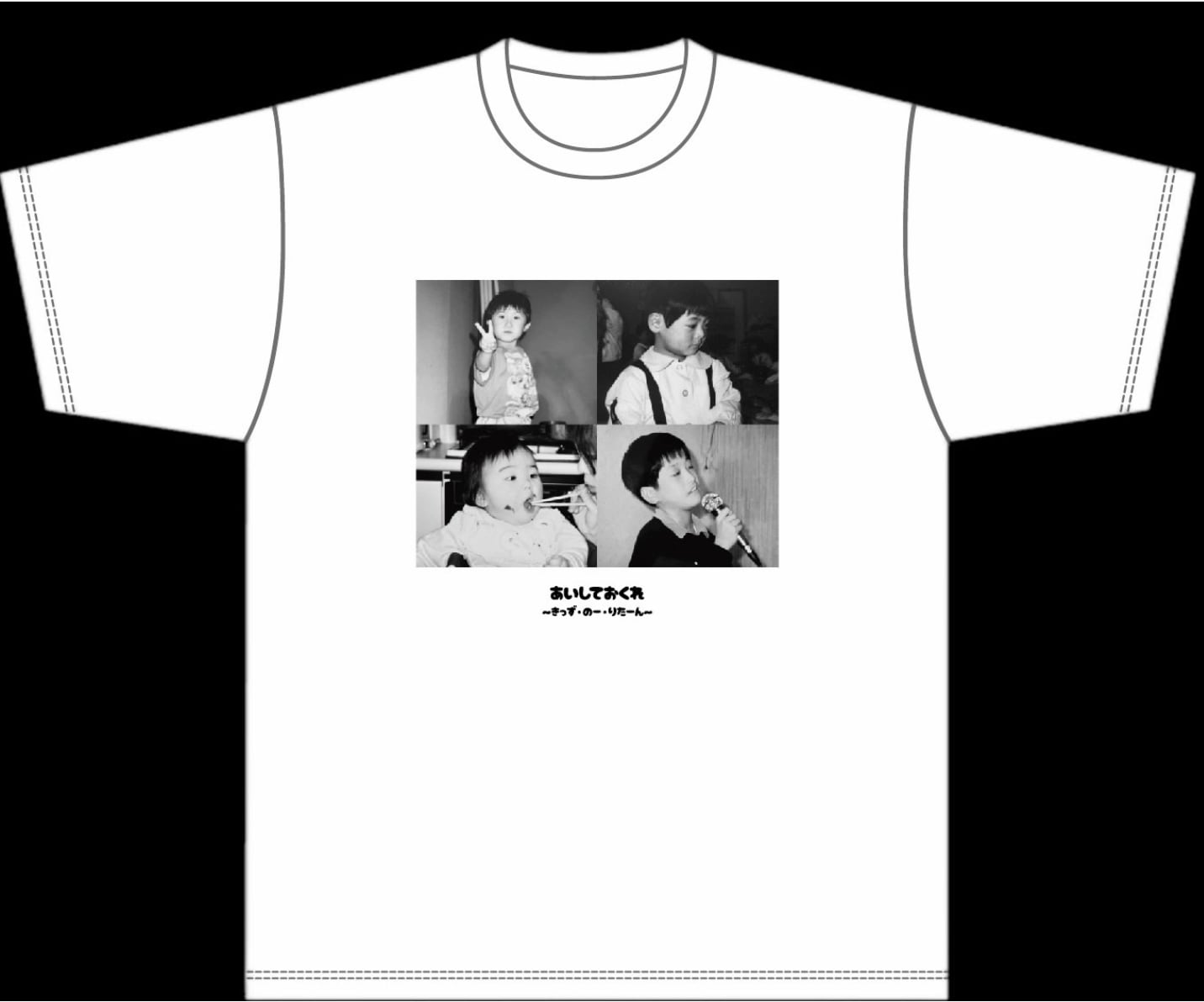 愛しておくれメンバー4人の幼少期の写真がプリントされたTシャツ、サイズはXLのみとなっております。